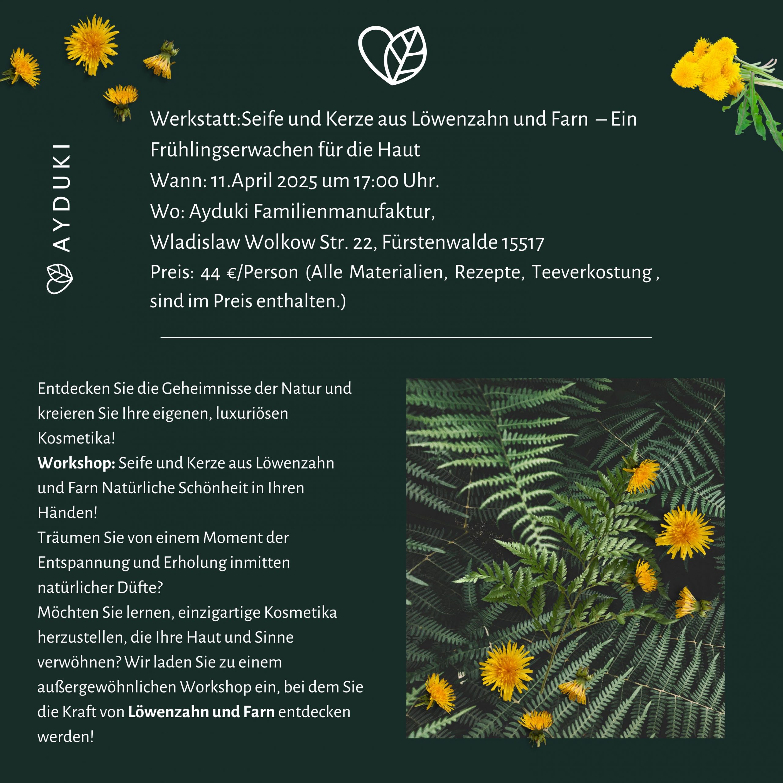 Wladislaw-Wolkow-Straße 22, 15517 Fürstenwalde/Spree, Niemcy Wladislaw-Wolkow-Straße 22Entdecken Sie die Geheimnisse der Natur und kreieren Sie Ihre eigenen, luxuriösen Kosmetika! Workshop: Seife und Kerze aus Löwenzahn und Farn – Natürliche Schönheit in Ihren Händen! Träumen Sie von einem Moment der Entspannung und Erholung inmitten natürlicher Düfte? Möchten Sie lernen, einzigartige Kosmetika herzustellen, die Ihre Haut und Sinne verwöhnen? Wir laden Sie zu […]